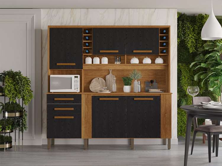 Estrutura 100% MDP, 6 Portas de Bater com Dobradiças Metálicas, 2 Gavetas com Corrediças Telescópicas, Amplo Nicho para Objetos e Utensílios Domesticos, 1 Nicho para Forno, 2 Nichos para Potes e Demais Objetos Culinários, 2 Garrafeiros na Laterais para 4 Garrafas cada, 1 Prateleira Interna, Detalhes Ripados e Puxadores em MDF e Pés Plásticos Reguláveis.
