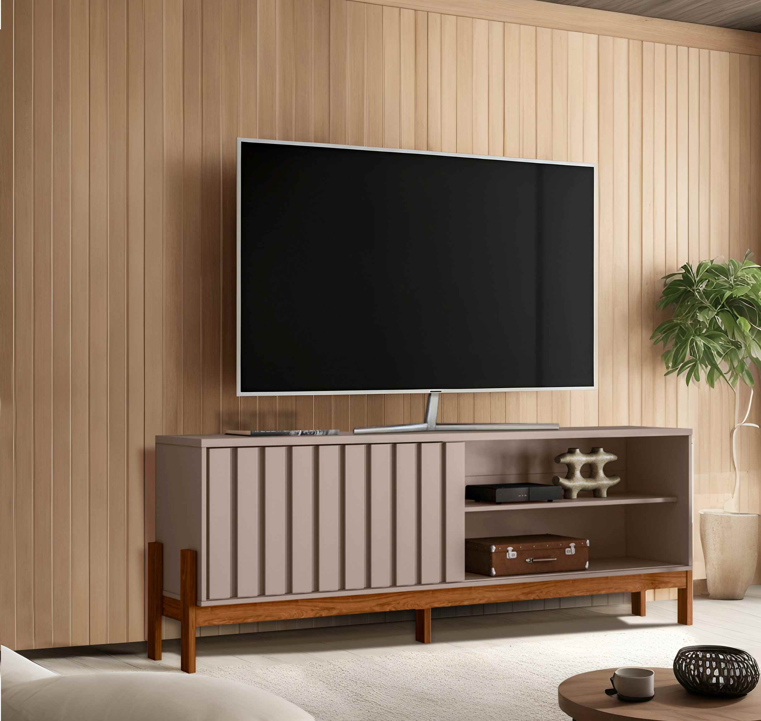 Bancada New Aurora 1.88, estrutura 100% MDP com tampo de 25mm, porta ripada deslizante e ideal para TVs até 75 polegadas.