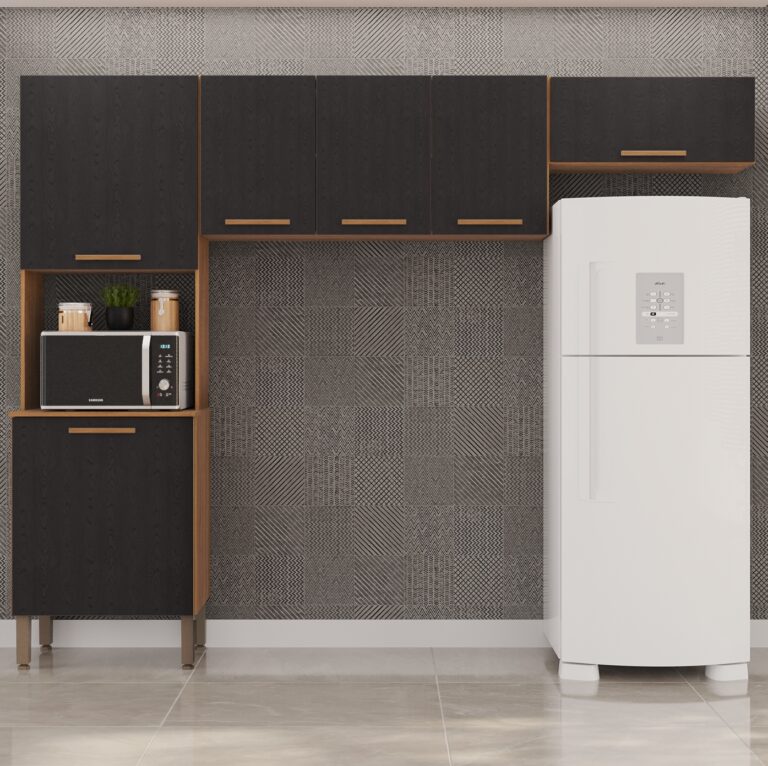 Cozinha 3 peças New Valência sem balcão, estrutura em MDP com espaço para microondas e puxadores de madeira.