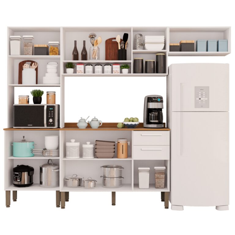 Cozinha New Valencia na cor branco com vidro fume em uma das portas do aéreo, estrutura em MDP com pintura touch de alta resistência.