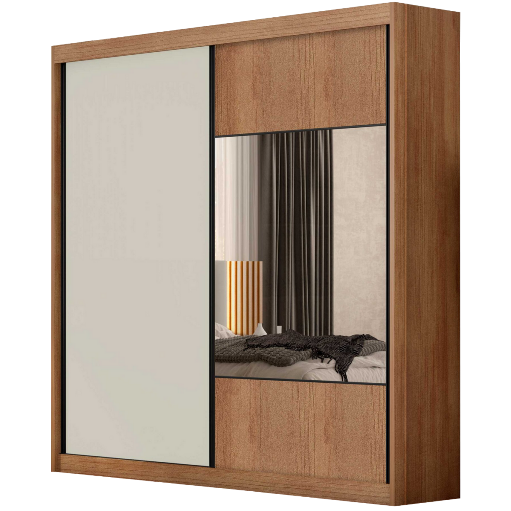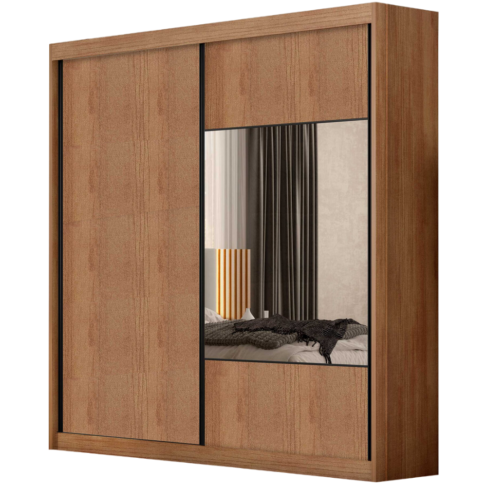 Elegante e funcional, este guarda-roupa 100% MDF com colunado de 25mm oferece amplo espaço interno no modelo Ele e Ela. Uma das duas portas conta com espelho, unindo praticidade e sofisticação ao ambiente. Trilhos de alumínio, roldanas com amortecedores e corrediças telescópicas garantem abertura suave e durabilidade.